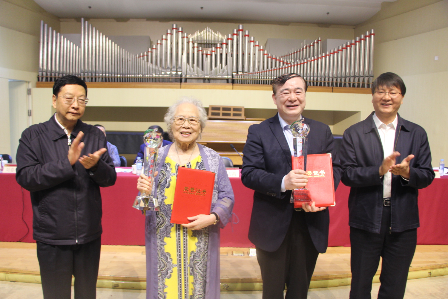 薛占海市长为俞峰校长、郭淑珍教授授予“支持延安市苹果产业后整理工作特别贡献奖”,答谢他们为延安苹果代言。