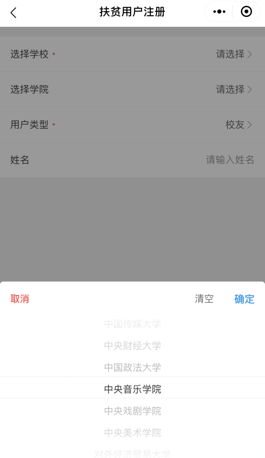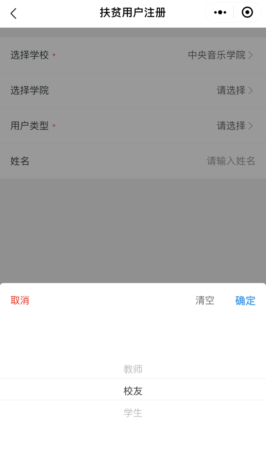 第五步:点击“用户类型”,根据自己实际身份选择;点击“学校名称”,选择kaiyun体育网页登录入口;输入“姓名”后,点击“提交”,至此身份绑定完成。