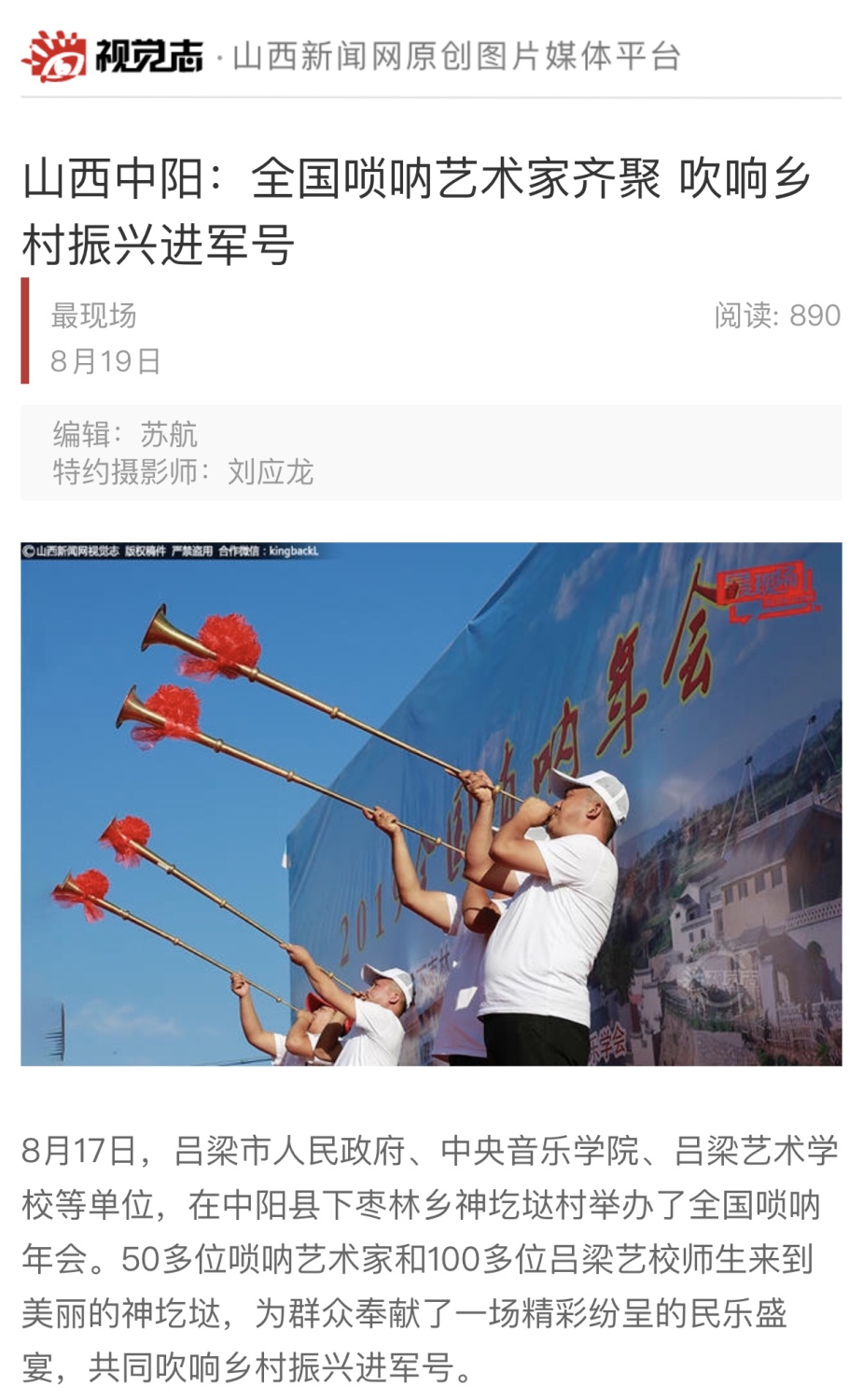 作为此次活动的重要环节和双实践的重要内容,与会专家一大早就深入到原国家级贫困县吕梁中阳县的神圪垯村,与当地的民间吹打艺人现场切磋交流,专业演奏家、教育家和吕梁艺校学生以及当地民间艺人共同演绎唢呐情缘,上百把唢呐齐奏黄土高坡的山梁之上,唢呐声声响彻黄土高原的千沟万壑。当天下午,艺术家们和唢呐学子顶着烈日在村子里为乡亲们奉献了一场唢呐盛宴。随后,在当地领导的带领下,参观了神疙垯村村史纪念馆,讲述贫困山村脱贫摘帽的故事,也为在场的专家和教师们上了一堂生动的主题党课。
