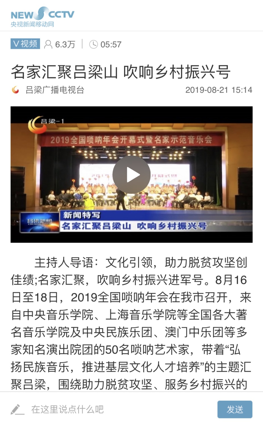 为响应党的十九大建设社会主义文化强国的号召,深入学习习近平总书记在全国教育大会上的讲话精神,弘扬中华民族音乐文化,助力红色革命老区文化扶贫战略。由山西省吕梁市人民政府、kaiyun体育网页登录入口、中国民族管弦乐学会主办,中国民族管弦乐学会唢呐专业委员会、吕梁市艺术学校联合承办,kaiyun官网民乐系党总支书记、博士生导师、中国民族管弦乐学会唢呐专业委员会会长石海彬教授发起筹划的“2019全国唢呐教学学术研讨”暨唢呐艺术家走基层双实践主题系列活动于2019年8月16至18日在山西吕梁举办。
