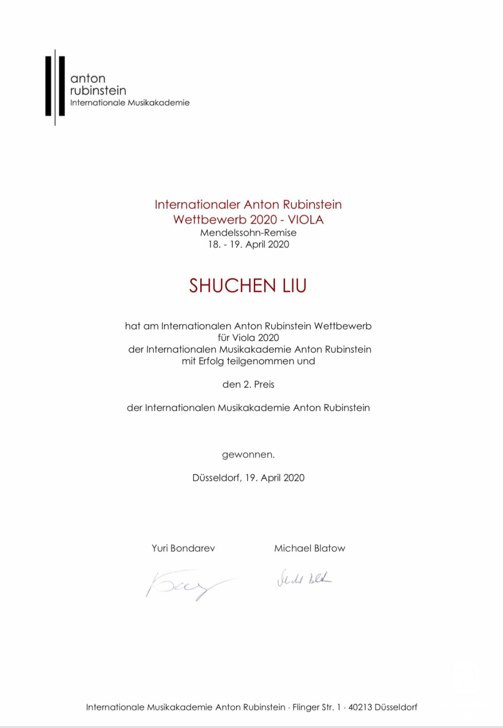 国际安东·鲁宾斯坦(Anton Rubinstein)音乐大赛本着支持和促进有才华的年轻音乐家、音乐学生、独奏者和未来的管弦乐队音乐家的原则通过两轮进行比赛。此次比赛有来自22个国家和地区的共54名选手,没有任何年龄限制。通过第一轮的激烈角逐最终共有16名选手进入决赛。其中中提琴比赛的决赛部分原计划是在德国杜塞尔多夫国际音乐学院安东·鲁宾斯坦音乐厅进行。