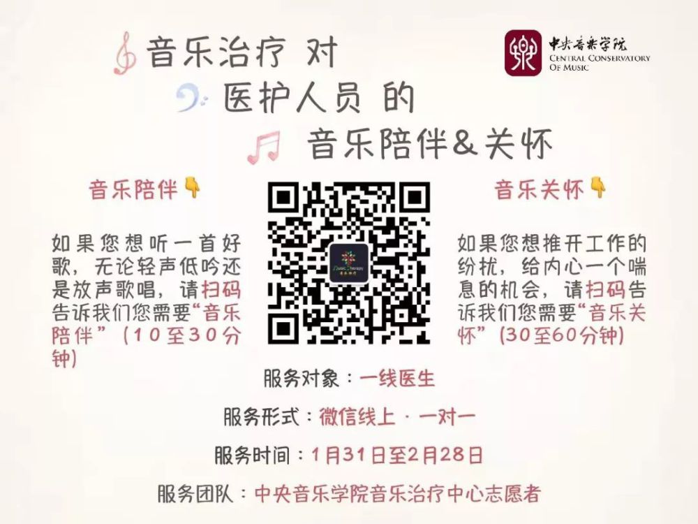 kaiyun体育网页登录入口音乐治疗志愿者们发挥音乐治疗师生的专业特长,为一线医护人员以及其子女开展线上音乐治疗志愿服务。针对一线医疗人员进行音乐治疗线上干预,干预主要采用生理心理社会模式(Biopsychosocial),使用循证音乐治疗实践,分级对一线医护人员进行音乐治疗志愿服务。干预主要分为两个层次: 指导医护人员进行自我关怀和与医护人员进行音乐陪伴。该设计可实施操作性强,干预时间短,能够在不打扰一线人员紧张工作的同时,及时地处理医护人员的情绪问题,保证其心理健康。目前志愿者团队为武汉市第九医院,武汉大学人民医院,武汉市第七医院的医护人员提供音乐志愿服务。