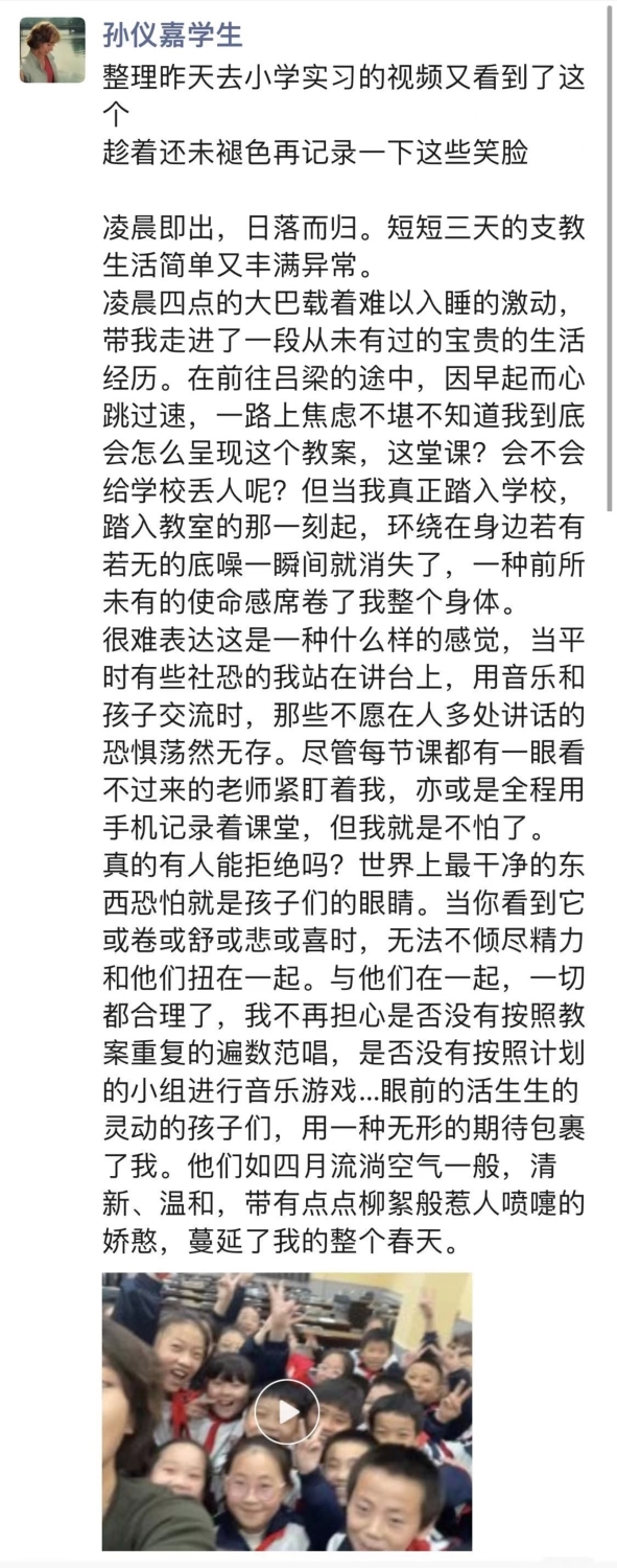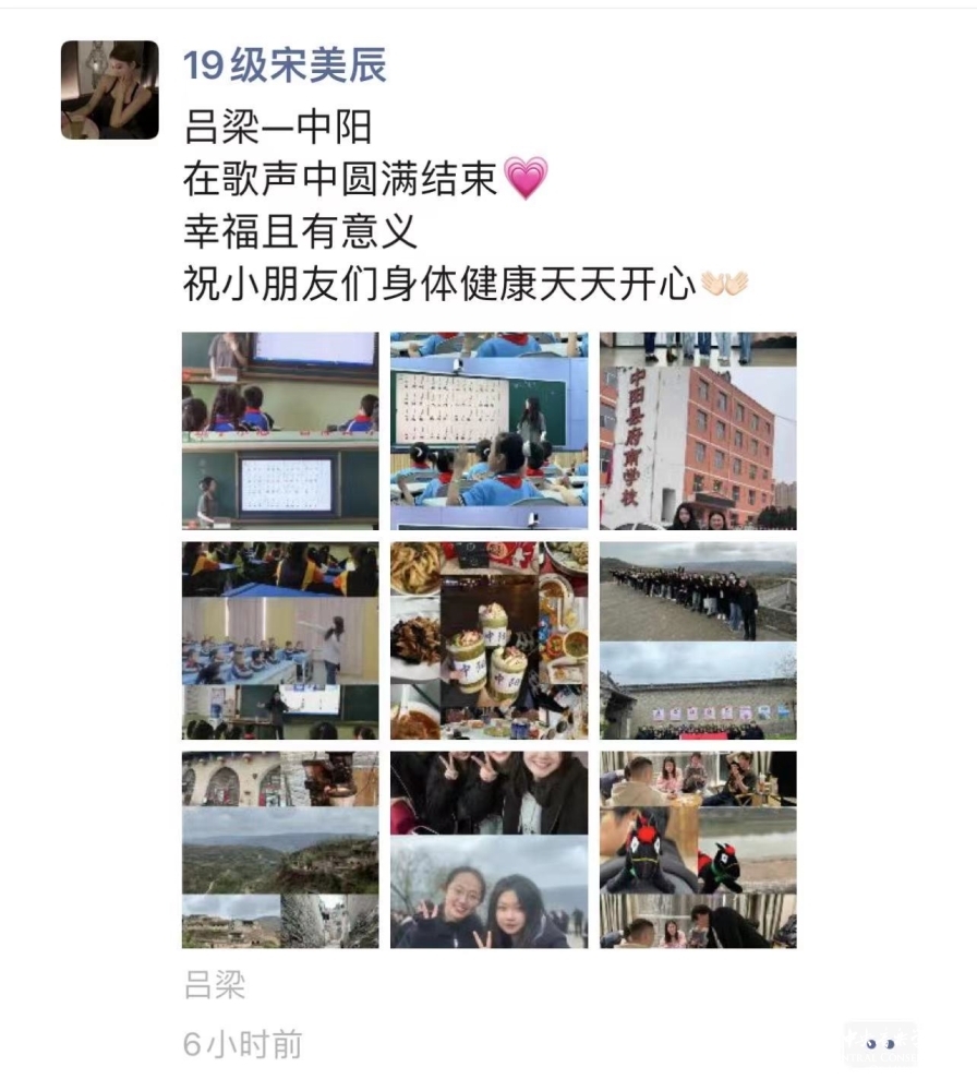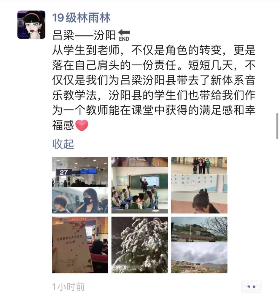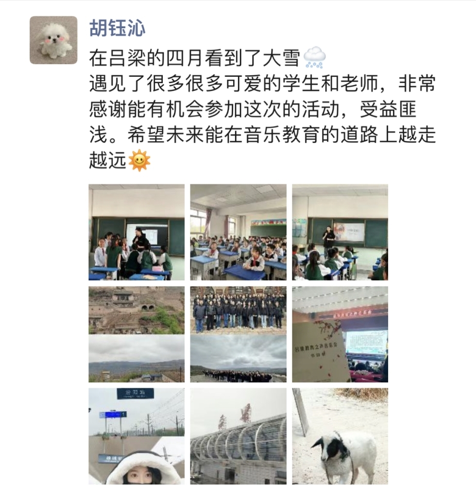 从19日的凌晨出发,到23日返京,kaiyun官网音乐教育学院的师生将热情带到了吕梁这片红色热土,师生们为走过的每一个地方带去了音乐的美好,带来了美育教育的力量,也燃起了孩子们的希望。47位师生用自己的力量践行着“音乐振兴乡村 艺术服务人民”的理念,真切的用一节节生动的课堂肩负起作为一名教育工作者的使命,同时将祖国各地的孩子们对艺术、对教育的渴望和热爱注入到我们未来的教学和学习中,让心中“让音乐属于每一个中国人”的种子茁壮成长。