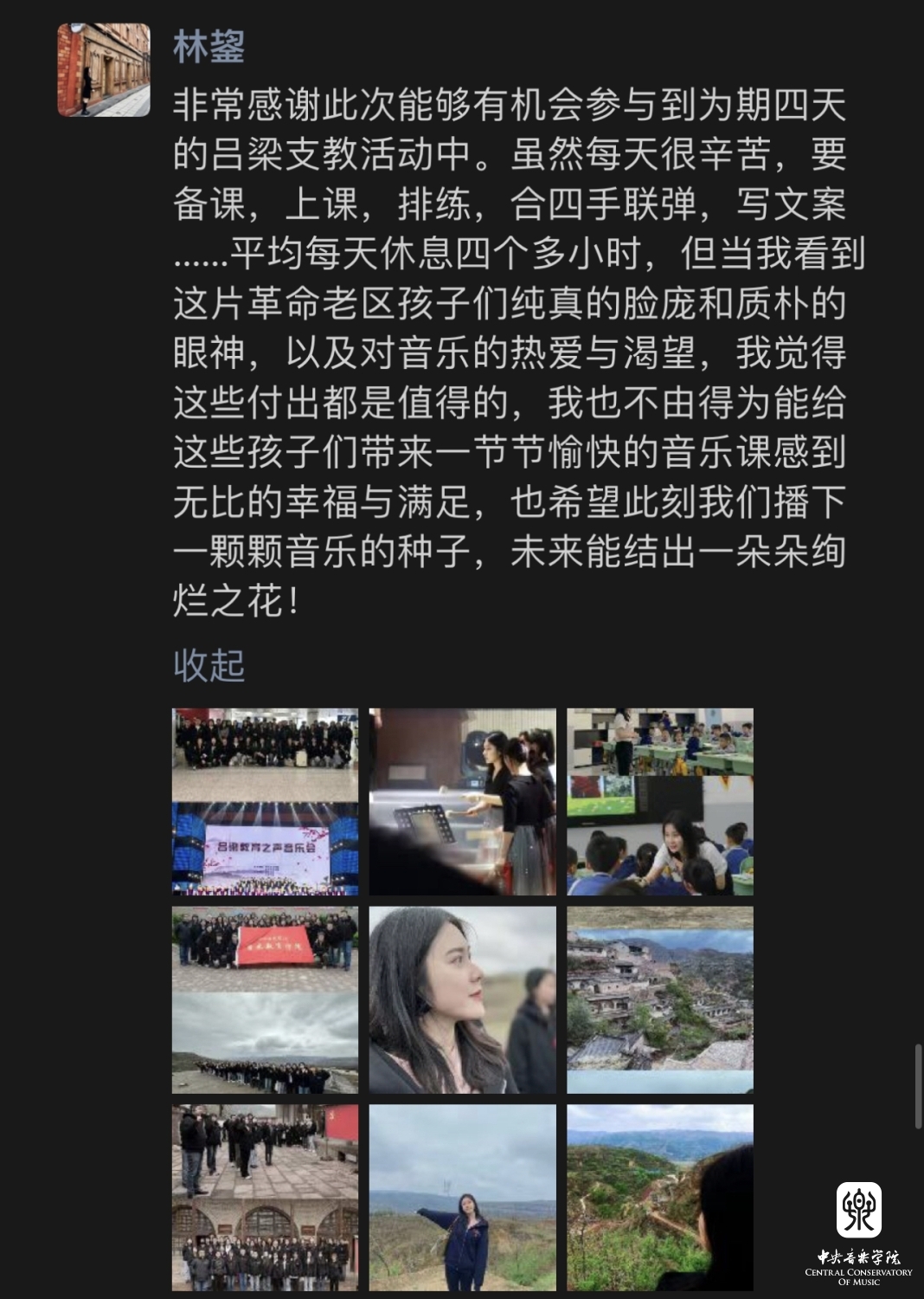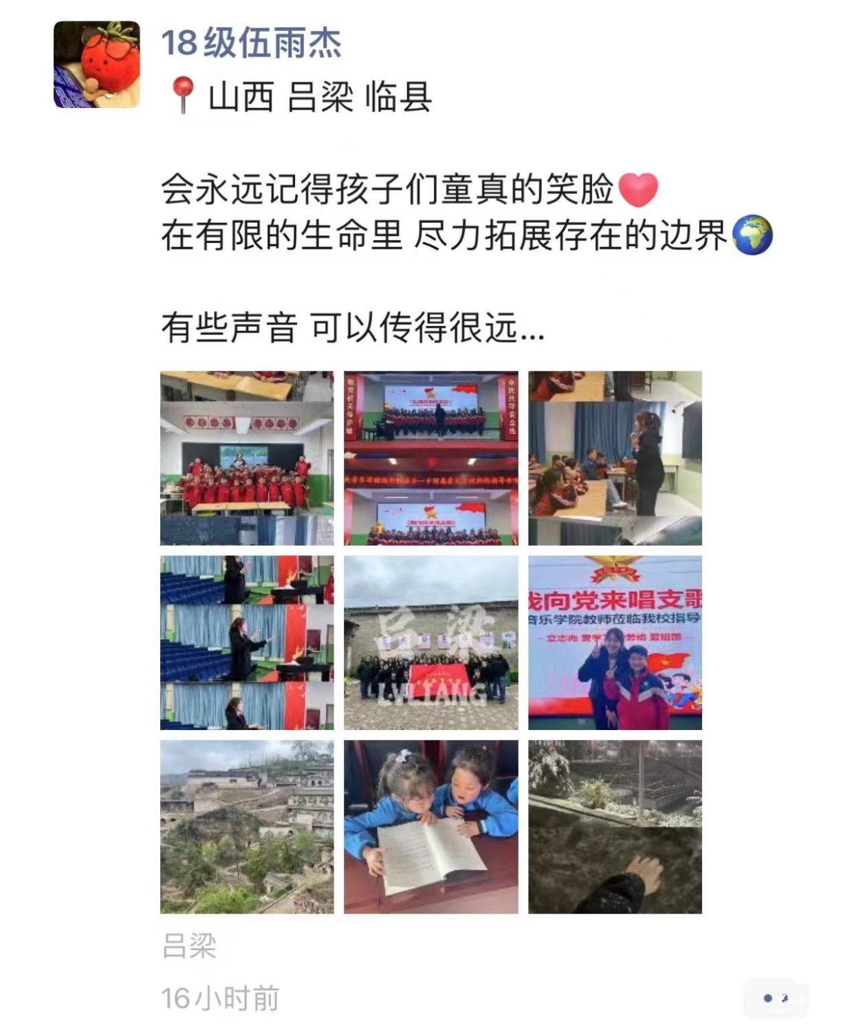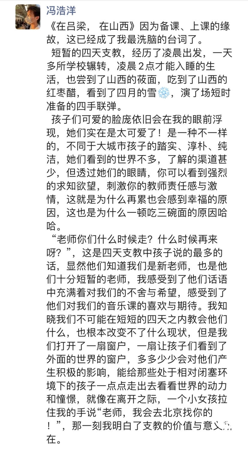 从19日的凌晨出发,到23日返京,kaiyun官网音乐教育学院的师生将热情带到了吕梁这片红色热土,师生们为走过的每一个地方带去了音乐的美好,带来了美育教育的力量,也燃起了孩子们的希望。47位师生用自己的力量践行着“音乐振兴乡村 艺术服务人民”的理念,真切的用一节节生动的课堂肩负起作为一名教育工作者的使命,同时将祖国各地的孩子们对艺术、对教育的渴望和热爱注入到我们未来的教学和学习中,让心中“让音乐属于每一个中国人”的种子茁壮成长。