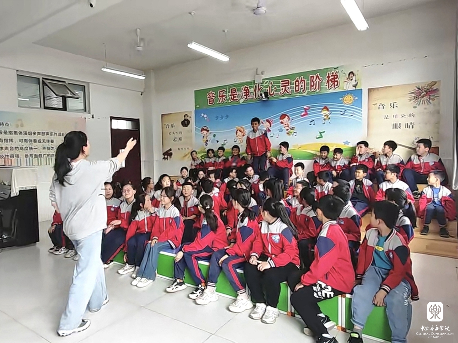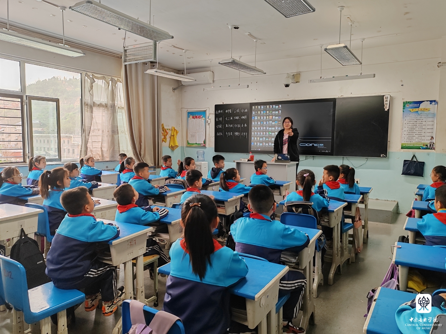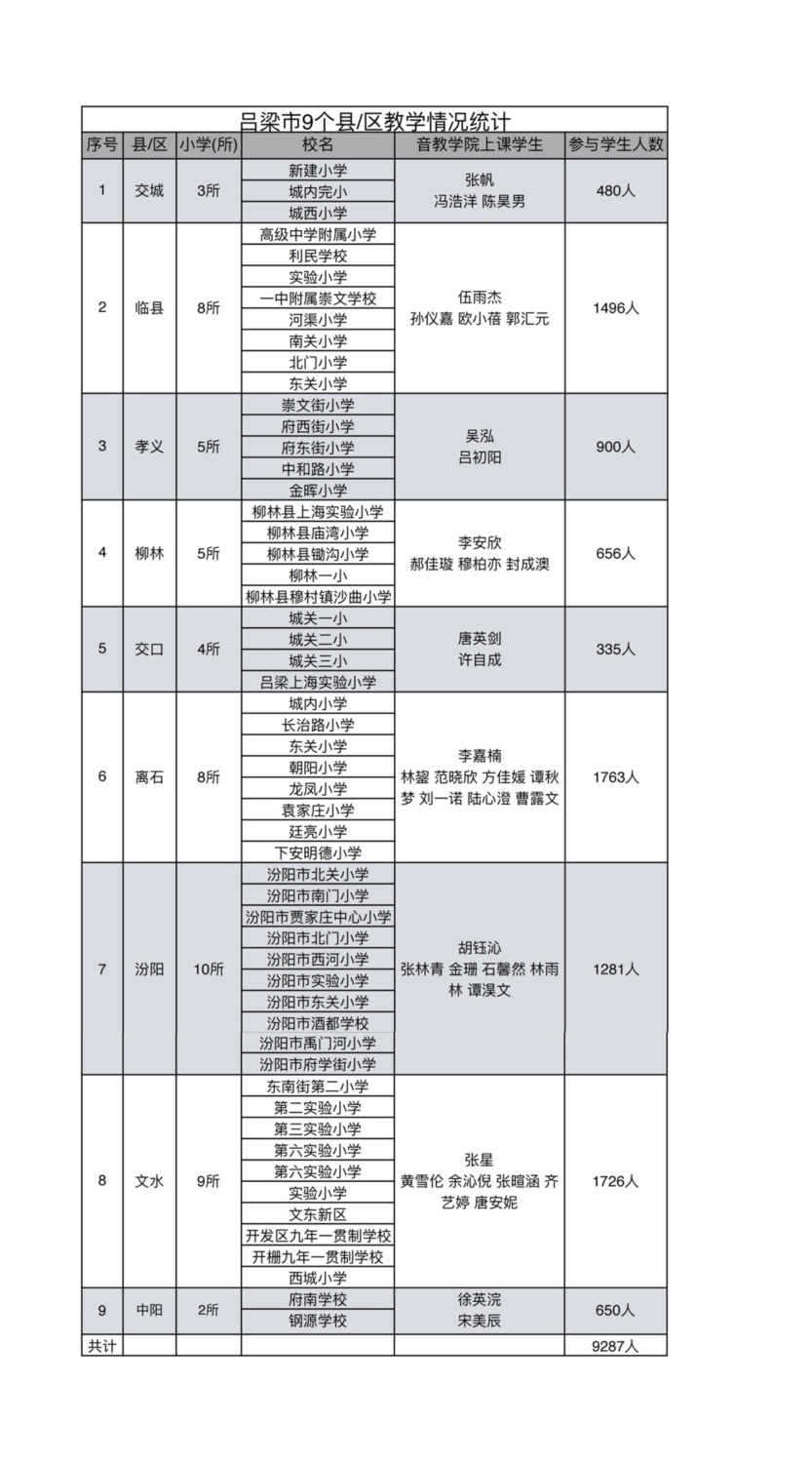 4月19日一早在飞机落地吕梁后,kaiyun体育网页登录入口音乐教育学院的9个学生小分队立即坐车分别赶往吕梁的9个区县,进入小学展开音乐课教学以及合唱团排练,同时还与当地的音乐教师一起相互交流,分享素质型学校音乐教育新体系的理念和方法。在短短3天的支教的活动中,共覆盖了吕梁9个县区的54所小学,149个班级的9287名学生,其中交城480人、临县1496人、柳林656人、离石1763人、文水1726人、中阳650人、交口335、汾阳1281、孝义900人。