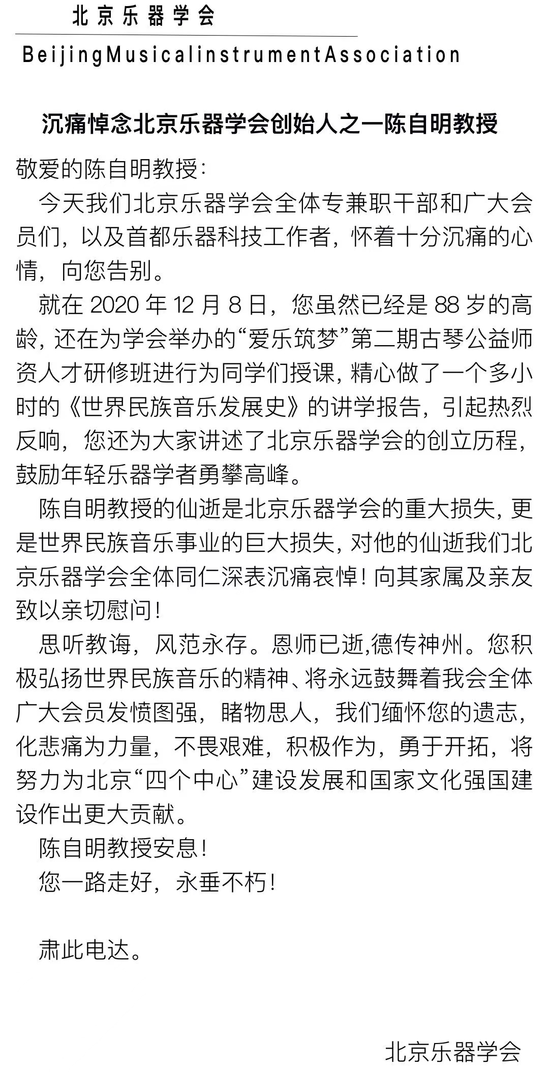 北京乐器学会致唁电 沉痛哀悼陈自明教授