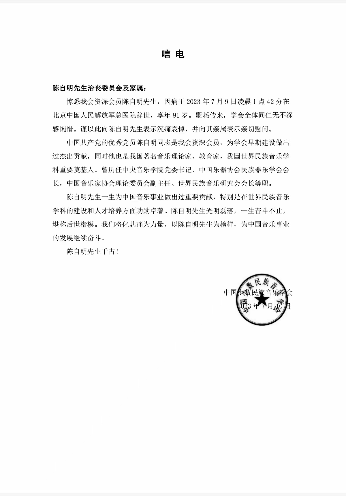 中国少数民族音乐学会致唁电 沉痛哀悼陈自明教授