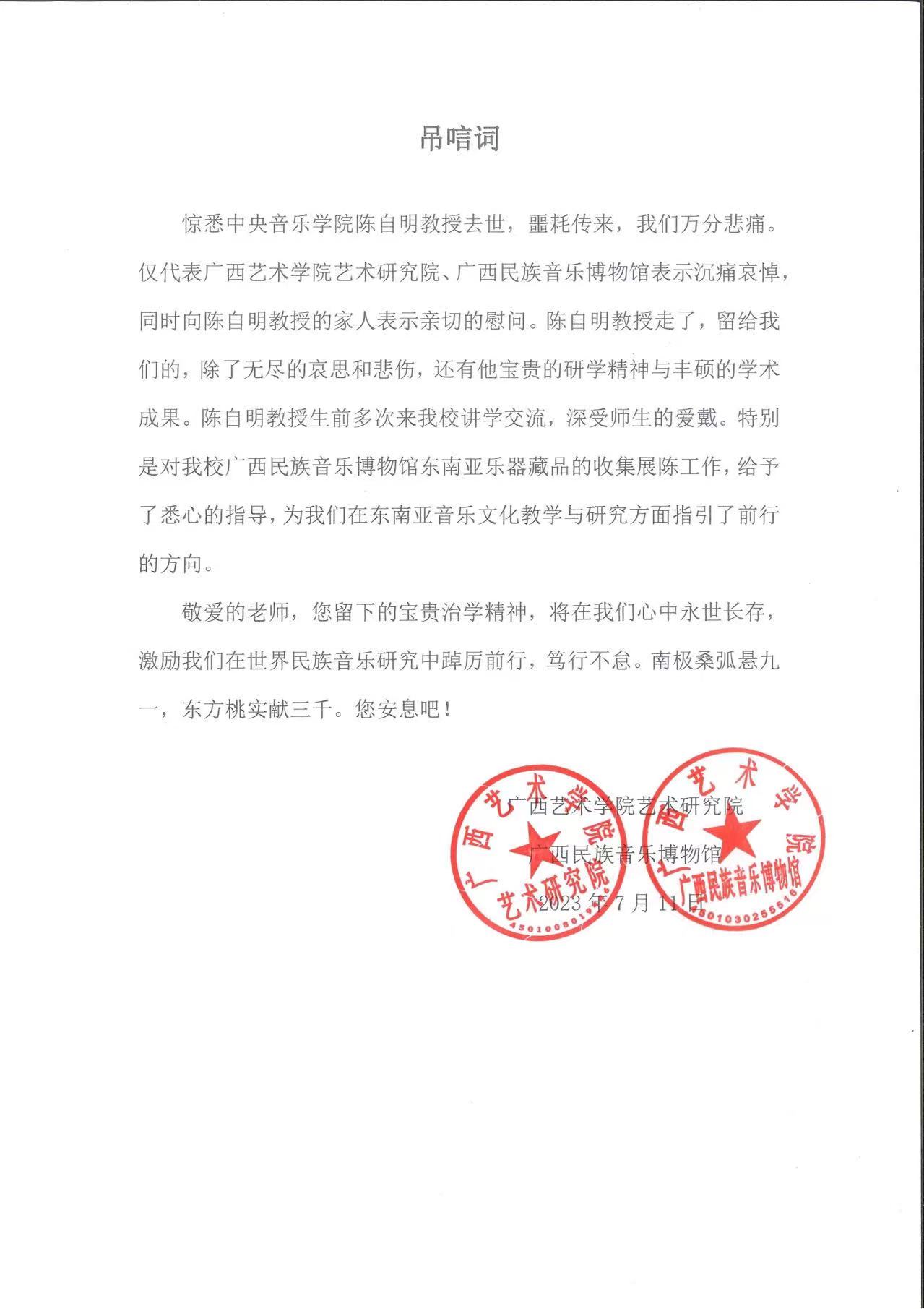 广西艺术学院致唁电 沉痛哀悼陈自明教授