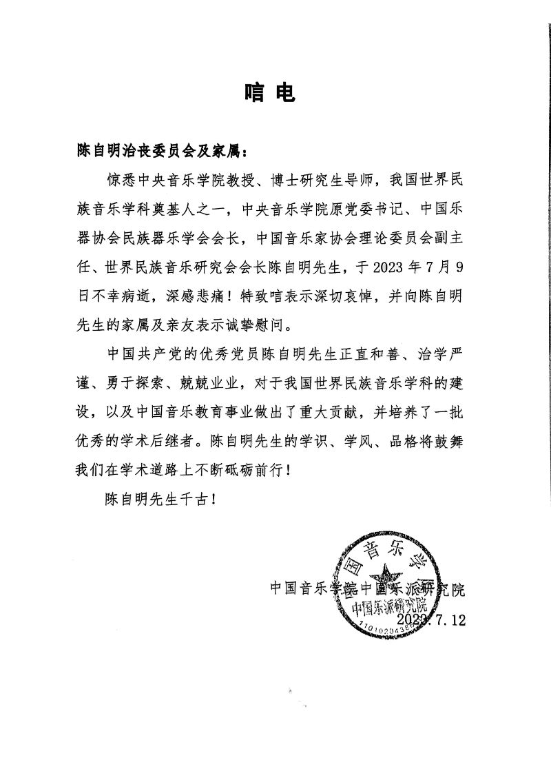 中国音乐学院致唁电 沉痛哀悼陈自明教授