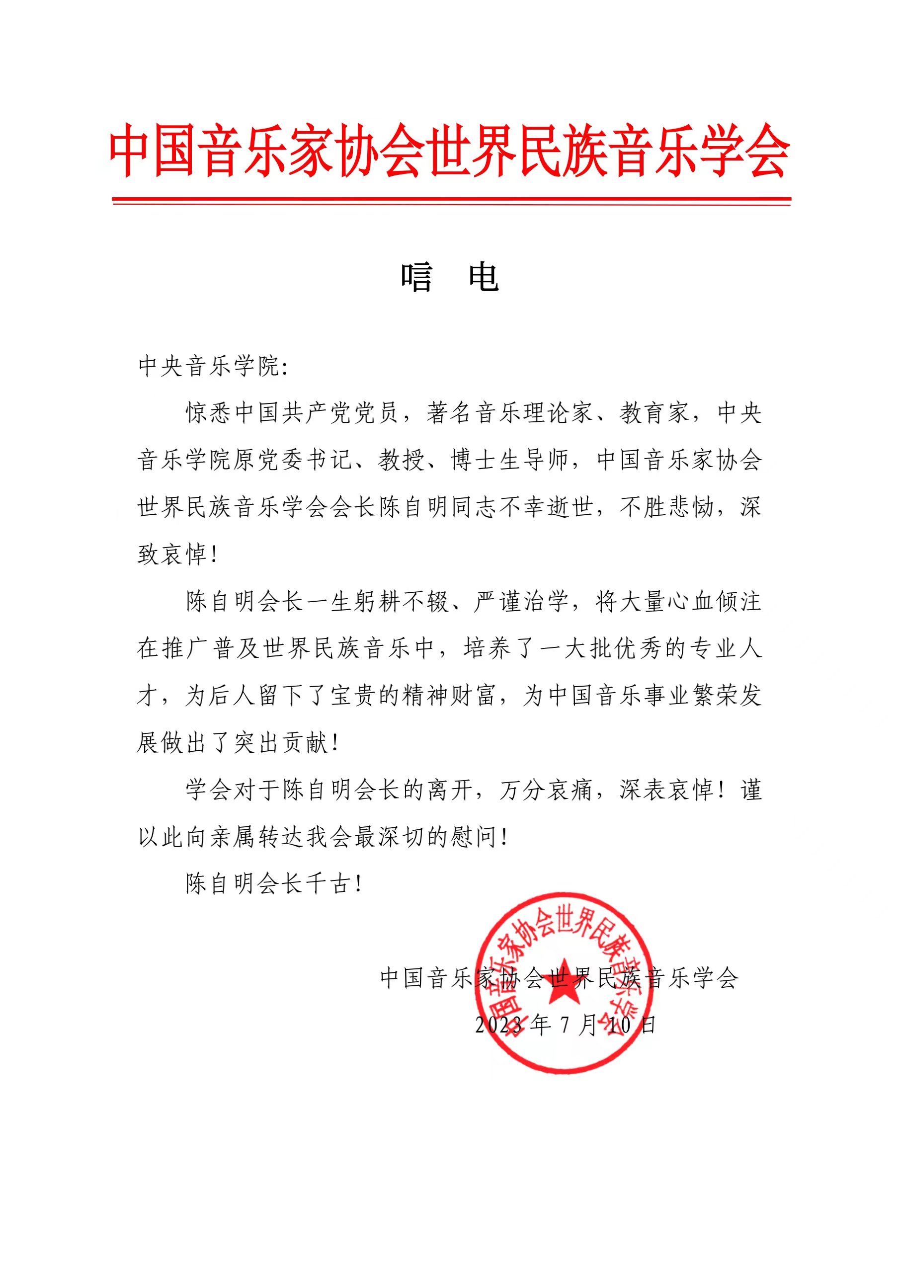 中国音乐家协会世界民族音乐学会致唁电 沉痛哀悼陈自明教授