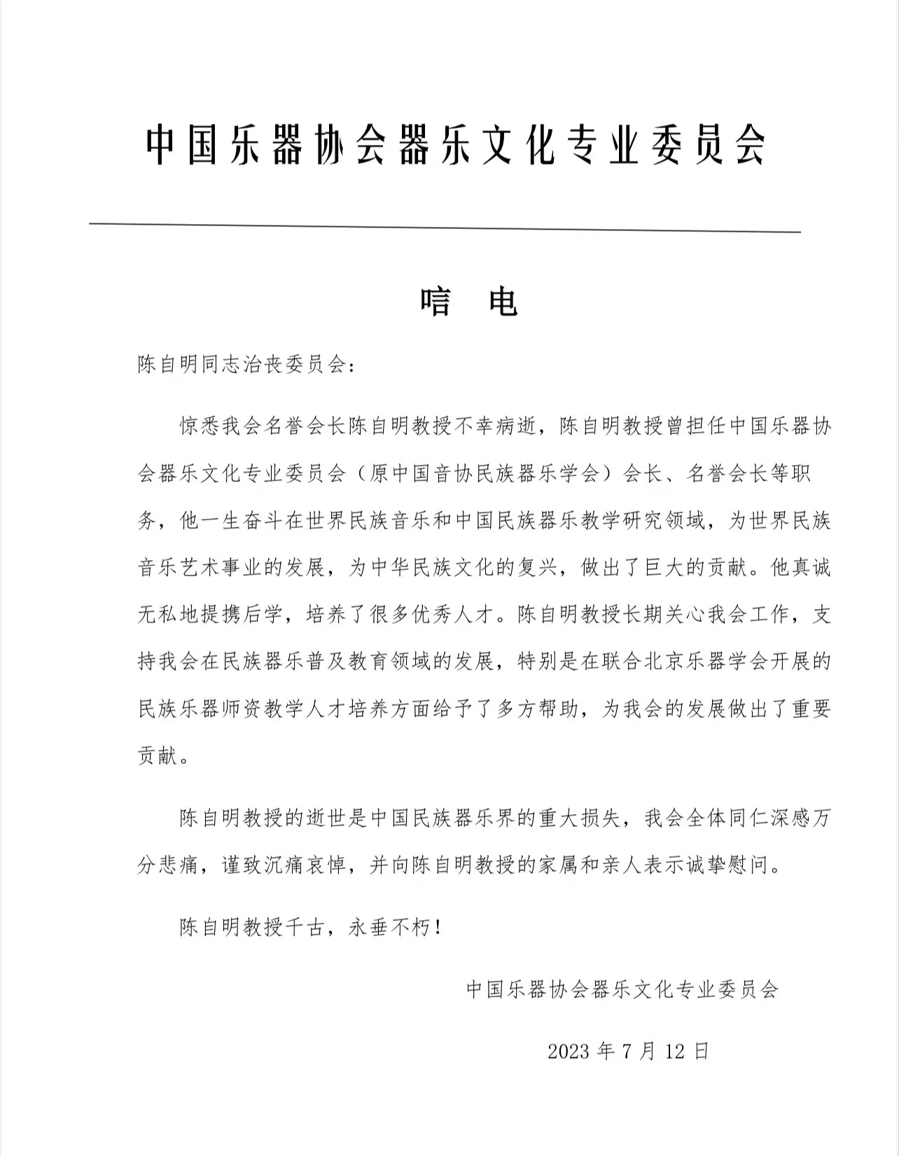 中国乐器协会器乐文化专业委员会致唁电 沉痛哀悼陈自明教授