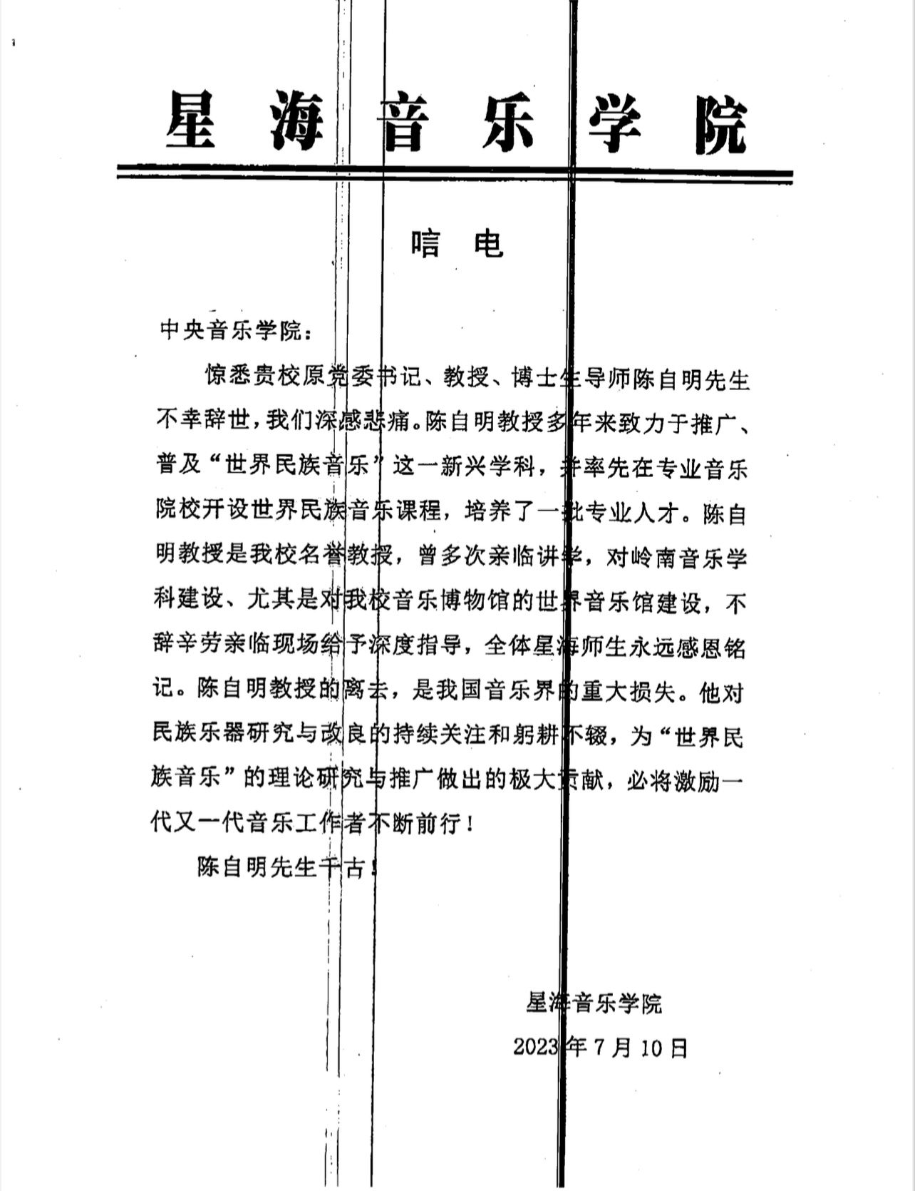 星海音乐学院致唁电 沉痛哀悼陈自明教授