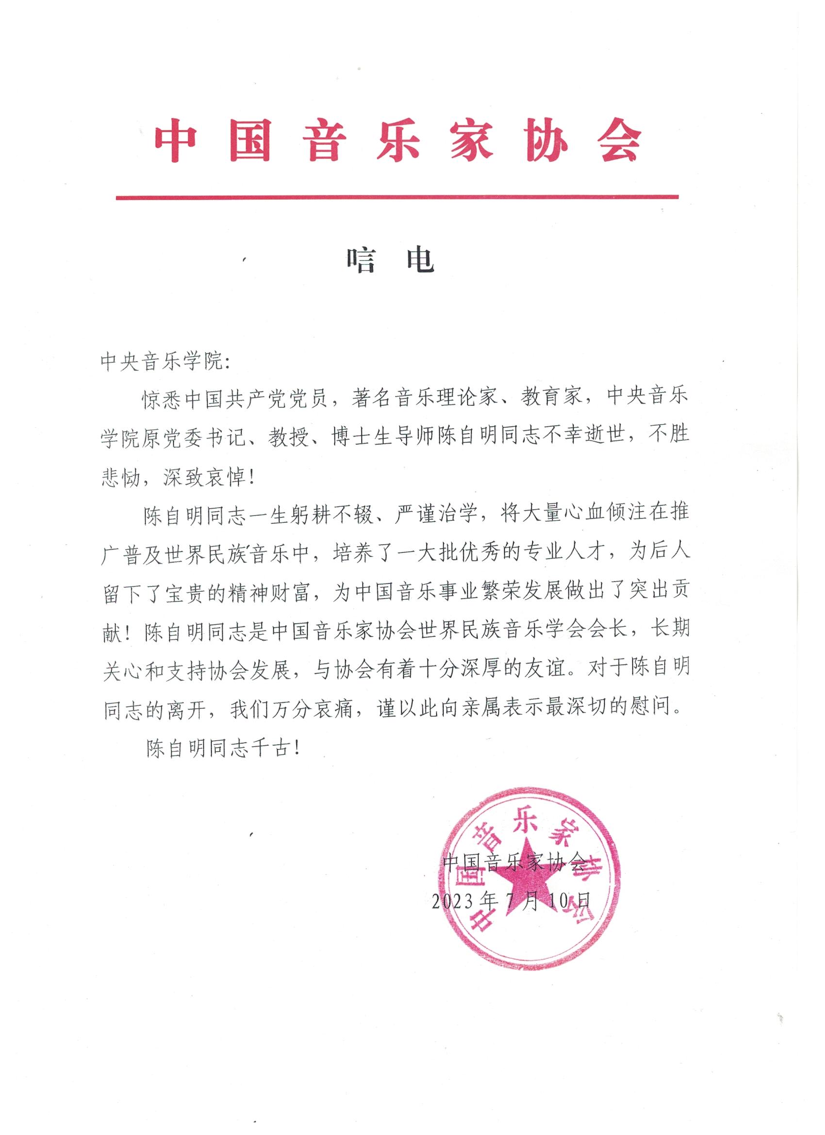 中国音乐家协会致唁电 沉痛哀悼陈自明教授