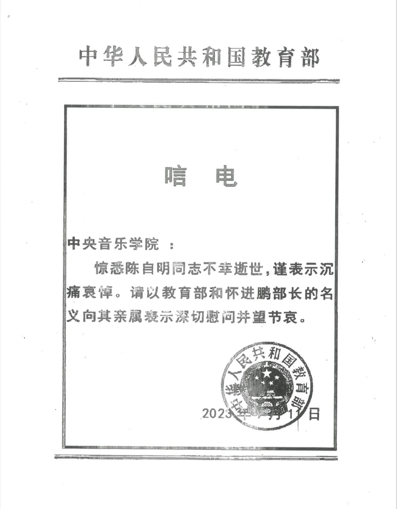 中华人民共和国教育部致唁电 沉痛哀悼陈自明教授