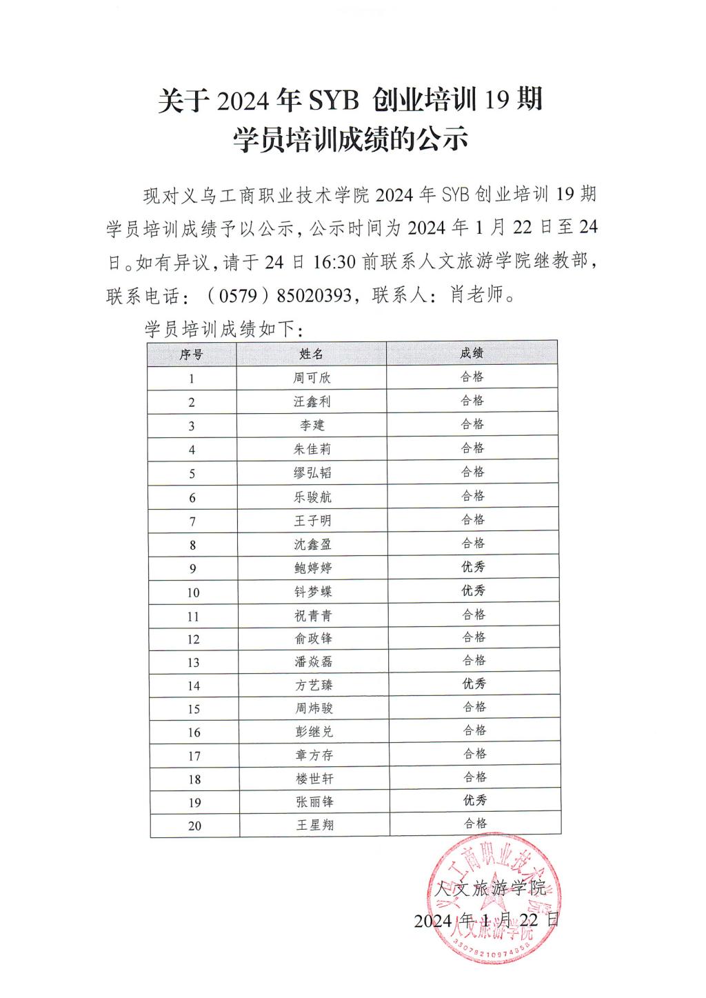 关于2024年SYB创业培训19期学员培训成绩的公示