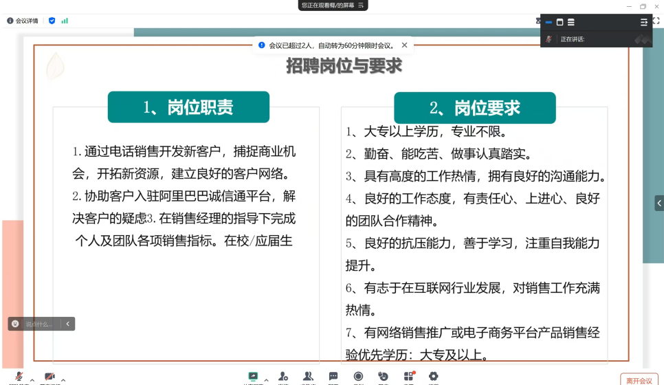 宣讲会上,宣讲人分别介绍了公司情况、公司产品、岗位需求、文化福利、成长发展和面试流程等方面内容。此次简洁高效的宣讲会,为毕业生和企业搭建了沟通的桥梁,为在外实习的同学们提供了便捷高效的就业服务。